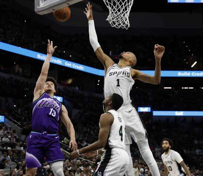 次节比赛,文班亚马暴扣扩大10分优势,爵士内外开花一波15-2攻势反超3分,文班亚马再度三分命中引领一波8-0攻势夺回5分优势。爵士冲击内线追分,文班亚马与福克斯内外开花得分,引领马刺逐步扩大59-51领先优势,爵士一波6-2攻势追分,马刺单节27-31被追回4分,上半场结束马刺61-57领先爵士。前两节比赛,马刺三分24中9,文班亚马12中7(其中三分9中5与罚球2中2)得到21+7与福克斯11分4助攻3抢断;爵士三分20中7,乔治15分4助攻。
